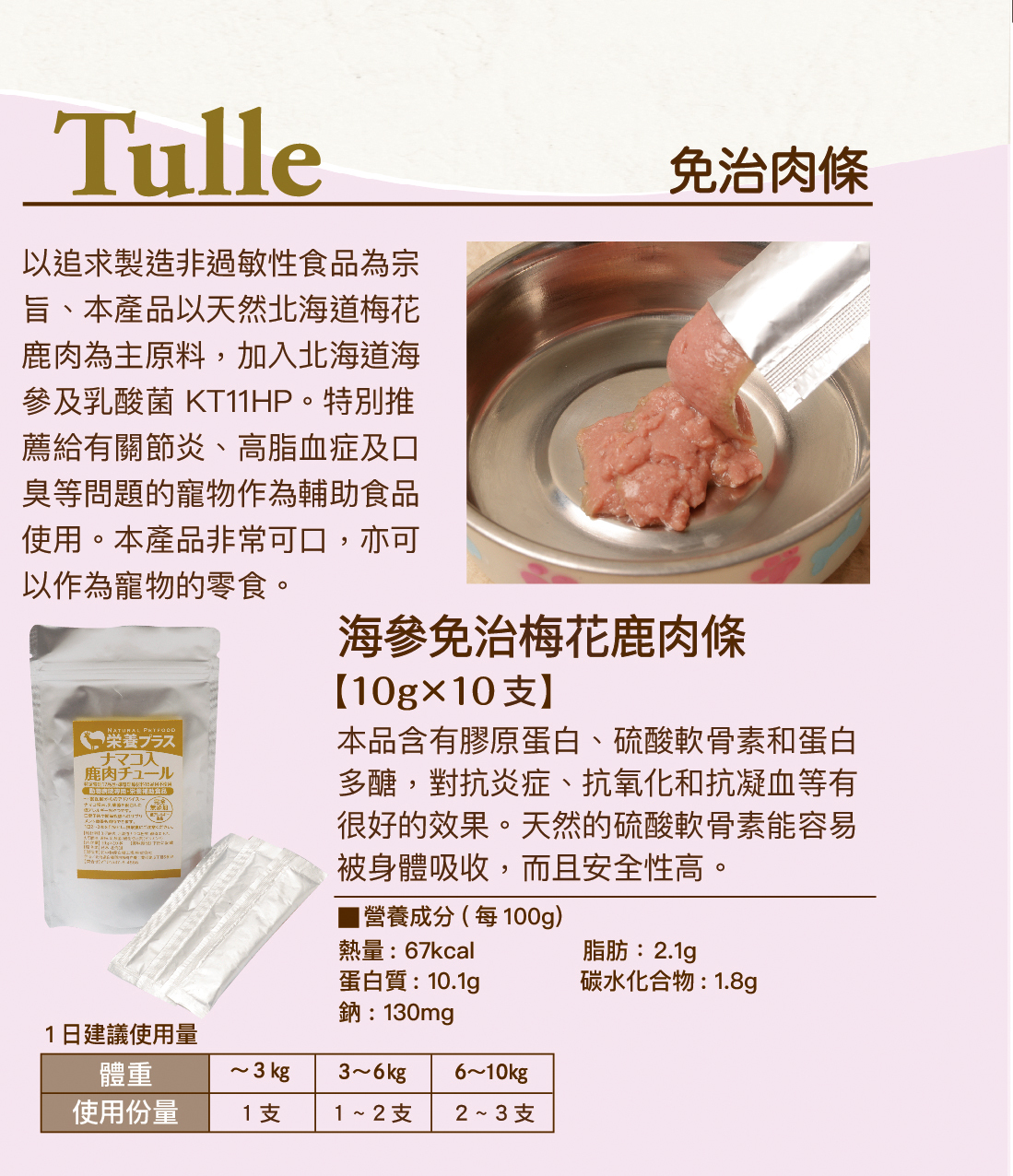 以追求製造非過敏性食品為宗旨、本產品以天然北海道梅花鹿肉為主原料,加入北海道海參,乳酸菌KT11HP。對於有關節炎,高脂血症、口臭等問題的寵物,本品可以作為輔助食品使用。